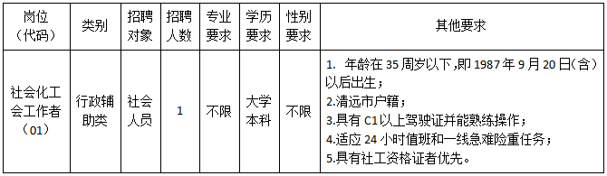 因工作需要,現(xiàn)清城區(qū)總工會(huì)面向社會(huì)公開(kāi)招聘1名社會(huì)化工會(huì)工作者(屬非編制人員,不列入用人單位編制序列,不擔(dān)任行政職務(wù)),現(xiàn)將有關(guān)事項(xiàng)公告如下: