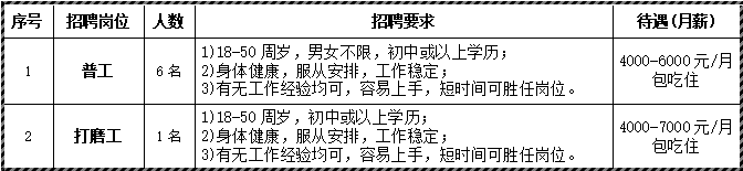 嶄新的標(biāo)準(zhǔn)工業(yè)廠房,工作環(huán)境舒適,新裝修的宿舍,設(shè)施齊全,居住環(huán)境溫馨。享受?chē)?guó)家法定有薪假期、生日福利、節(jié)日福利、年終福利、公司年會(huì)、旅游等。本公司訂單充足穩(wěn)定,長(zhǎng)白班,待遇好,包吃住,準(zhǔn)時(shí)發(fā)放工資。所招崗位的工作內(nèi)容均有人教,晉升和加薪空間大。歡迎來(lái)公司面試或電話詳細(xì)了解!